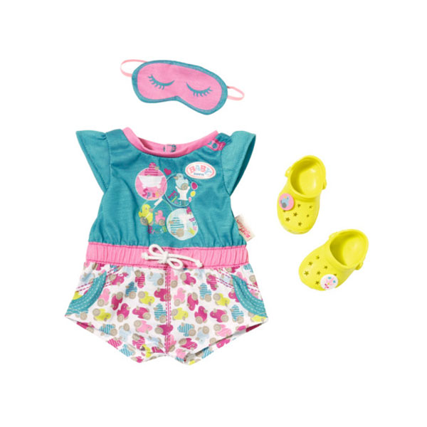 Набор одежды для куклы "Беби Бон" - это универсальный комплект, который отлично подойдет как для сна, так и для использования в роли домашней одежды. Комплект состоит из яркого трикотажного комбинезона с шортиками, желтых резиновых шлепанцев и удобной повязки для сна с аппликацией в виде закрытых глаз.