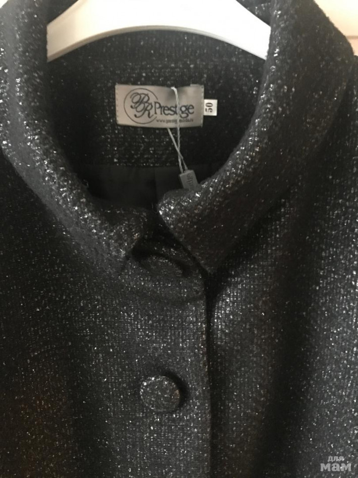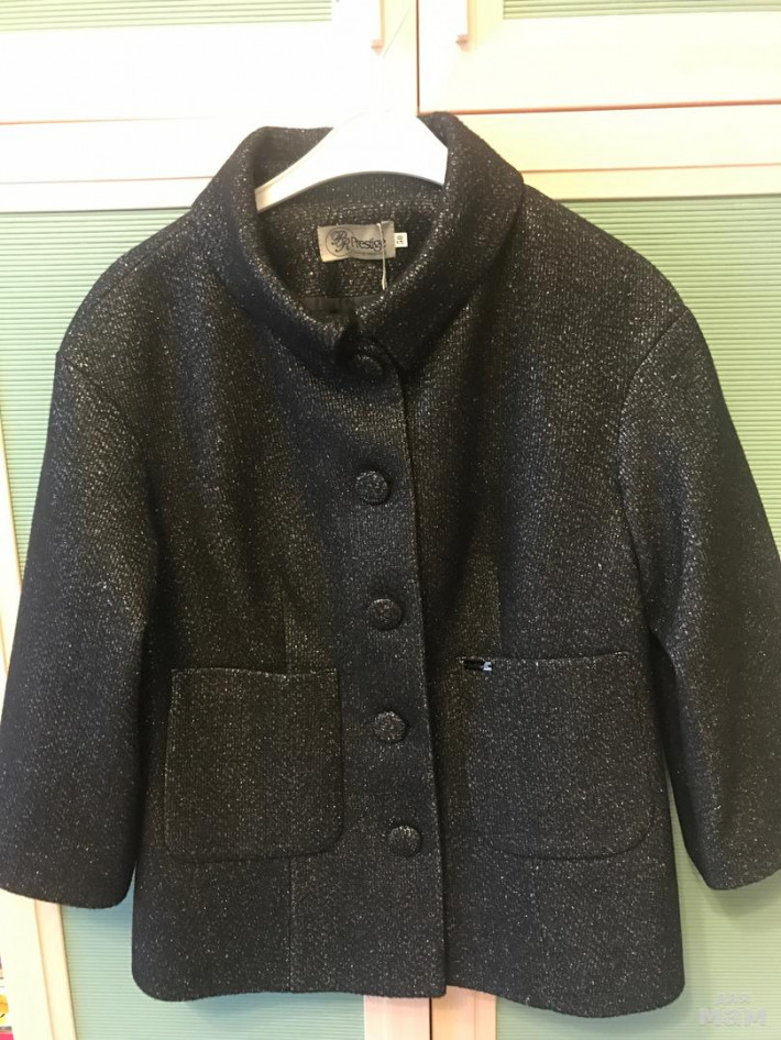 Жакет выполнен из трикотажного полотна с добавлением люрексовой нити, в стиле Коко Шанель. Стояче - отложной воротник, 3/4 рукав, спереди накладные карманы, застежка на пуговицах обтянутые тканью. Длина 62 см. длина рукава 41 см.