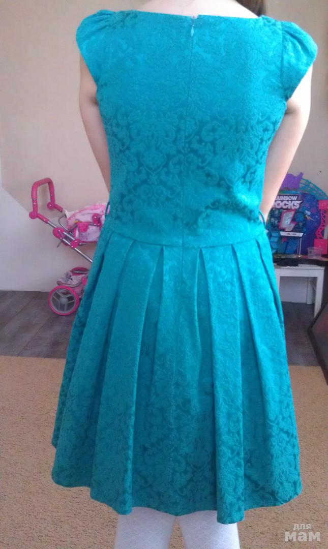 Элегантное платье из жаккарда изумрудного цвета с белым хлопковым подъюбником, длина по колено. Подойдет девочке ростом 130 см, но талия будет занижена. При росте 140-146, талия стандартной посадки. Состояние нового платья.