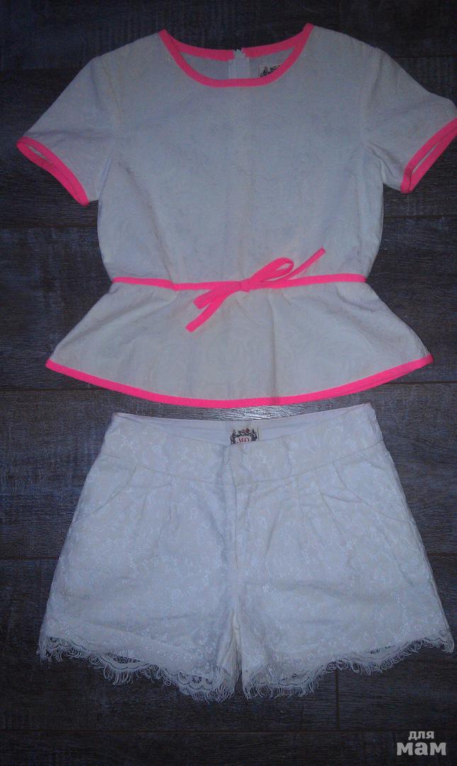Продам шорты+блузка il Mio Tutto. Размер 134-140. Блузку ни разу не успели одеть, шорты-пару раз. Состояние идеальное. Внутренний слой шорт-легкий хлопок , наружный - хлопковое кружево с бахромой по низу. Материал блузки-жаккард (60%хлопок, 35% полиэстер, 5% спандекс).