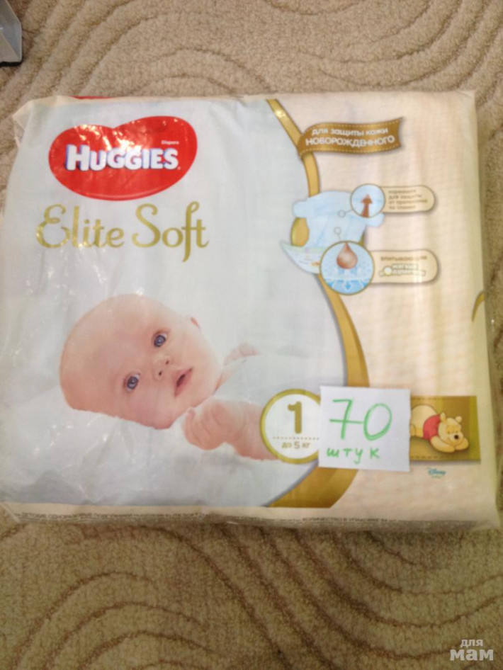 Подгузники Huggies Elite Soft 1 (до 5 кг) 70 шт для новорожденных.