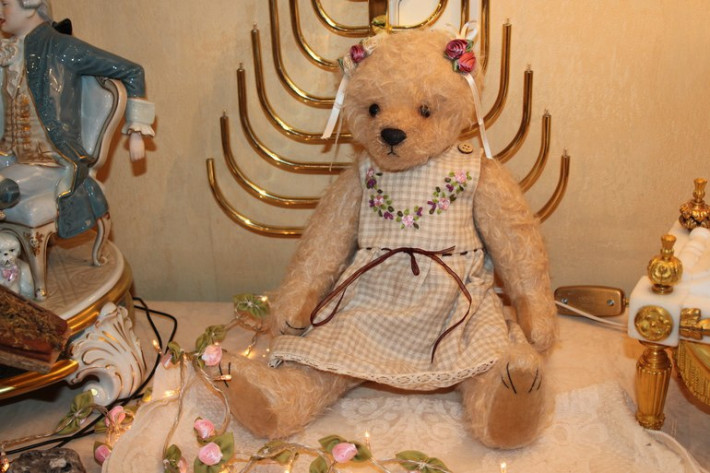 Милейшее создание, мишка с игривыми цветочками на ушах, в красивом платье. Высота 50 см. Игрушка была куплена в Америке на аукционе. Цена 2500