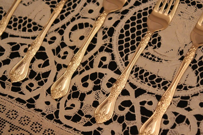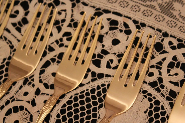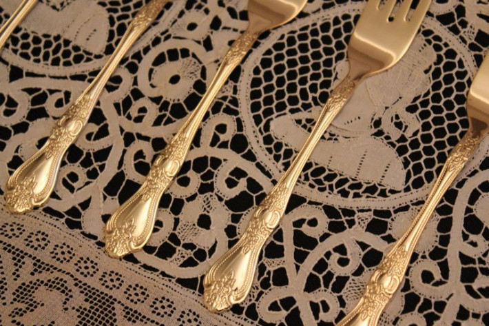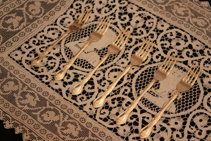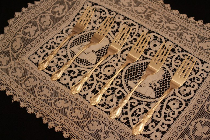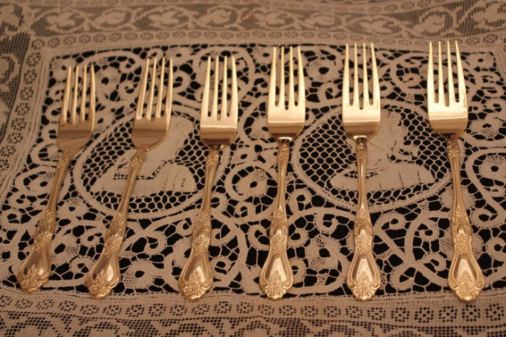 Набор из 6-ти красивых столовых вилок Германия. Рукояти красиво инкрустированы, золотого цвета, очень легкие, золото-фольгированное покрытие, мыть с осторожностью! Длина вилки-20см Цена 500 руб.