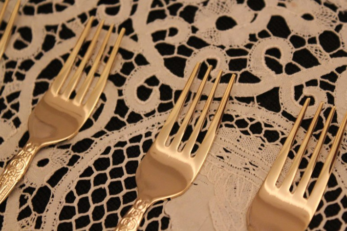 Набор из 6-ти красивых десертных вилочек, Германия. Рукояти красиво инкрустированы, золотого цвета, очень легкие, золото-фольгированное покрытие. Длина вилочки -14 см Цена 400 руб