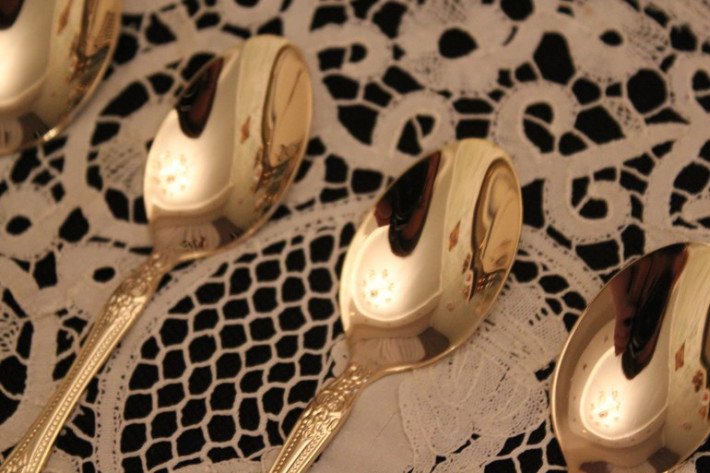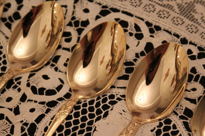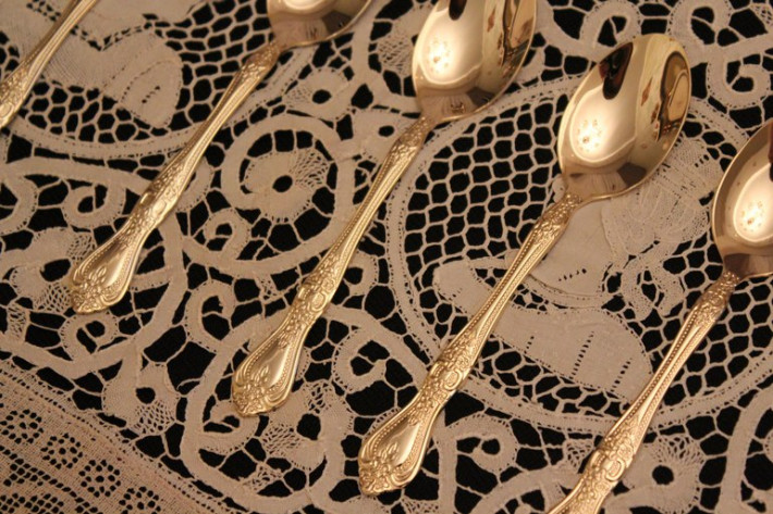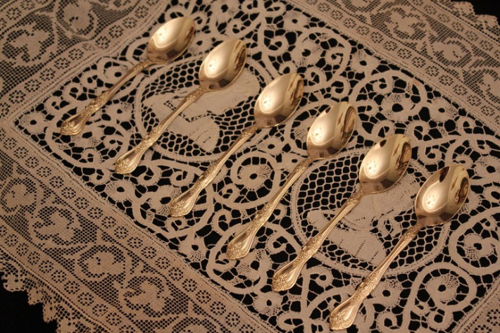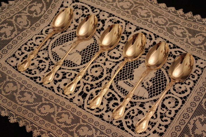 Набор из 6-ти красивых чайных ложек, Германия. Рукояти красиво инкрустированы, золотого цвета, очень легкие, золото-фольгированное покрытие, мыть с осторожностью! Длина ложки -14 см Цена 400 руб.