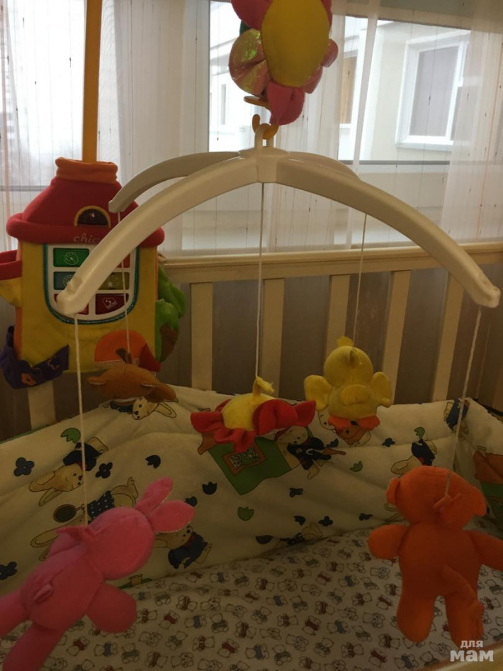 Очень качественный, яркий музыкальный мобиль со множеством функций: 2 функции с вращением (классическая музыка и звуки природы), 2 функции без вращения ( Музыка и звуки природы), функция включения с реакцией на звук. 2 уровня громкости. Когда ребёнок подрастёт , можно использовать как музыкальный домик с кармашками для зверушек. Удобен в уходе: игрушки снимаются, стираются в машине.
