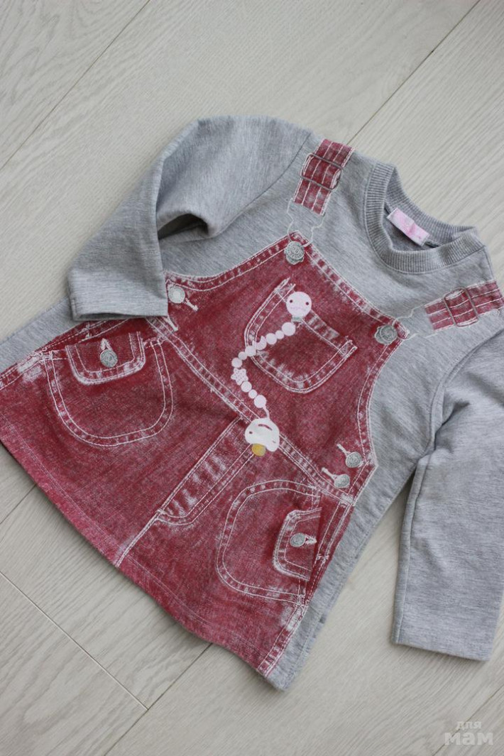 Удобное, оригинальное. С принтом джинсового сарафана и пустышки. Кнопки растегиваются по всей длине.