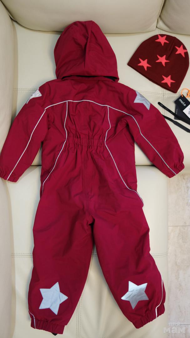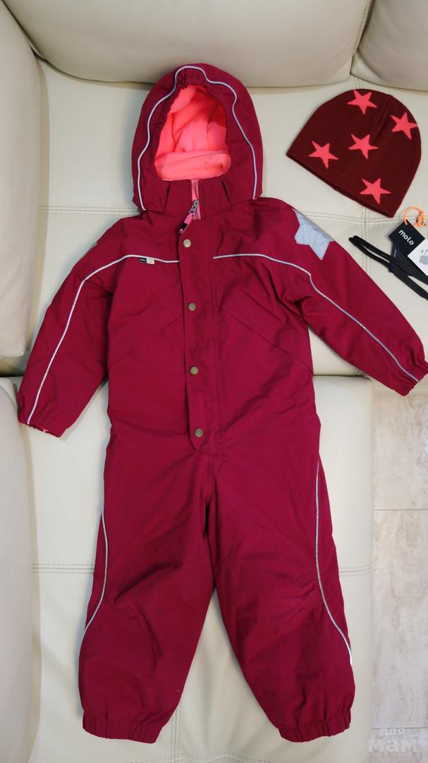 Бу 2 сезона. Маркировка роста 104 + около 6см запас. Шапка на ОГ около 50см, размер 3-5л. Носили примерно в 3,8 и 4,8. Фурнитура вся рабочая. Попа, колени потерты. На одной штанине внизу подшита маленькая дырочка. Штрипки, запчасти,бирки. Светоотражающие полоски потрескались. Шапочка на флисе, без нареканий.