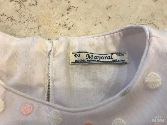 Платье Майорал, на этикетке указано на 110 см, но по мне, так идеально на 105 см (плюс/минус 5 см), нежнейшее, светлое, но с легким сиреневым эффектом, ткань немного с люриксной ниткой. Очень красивое, жаль, что выросли из него мгновенно. Одевали два раза на выход, в идеальном состоянии. На фото платье темнее получилось, в реале оно очень светлое с легким сиреневым отблеском.