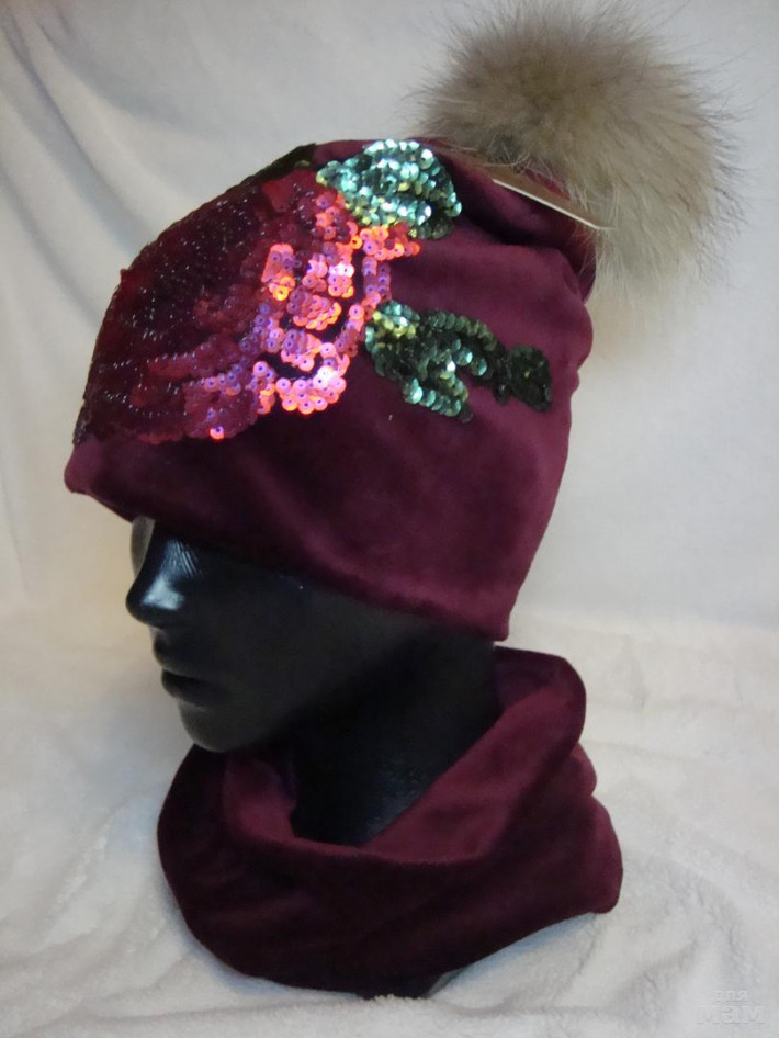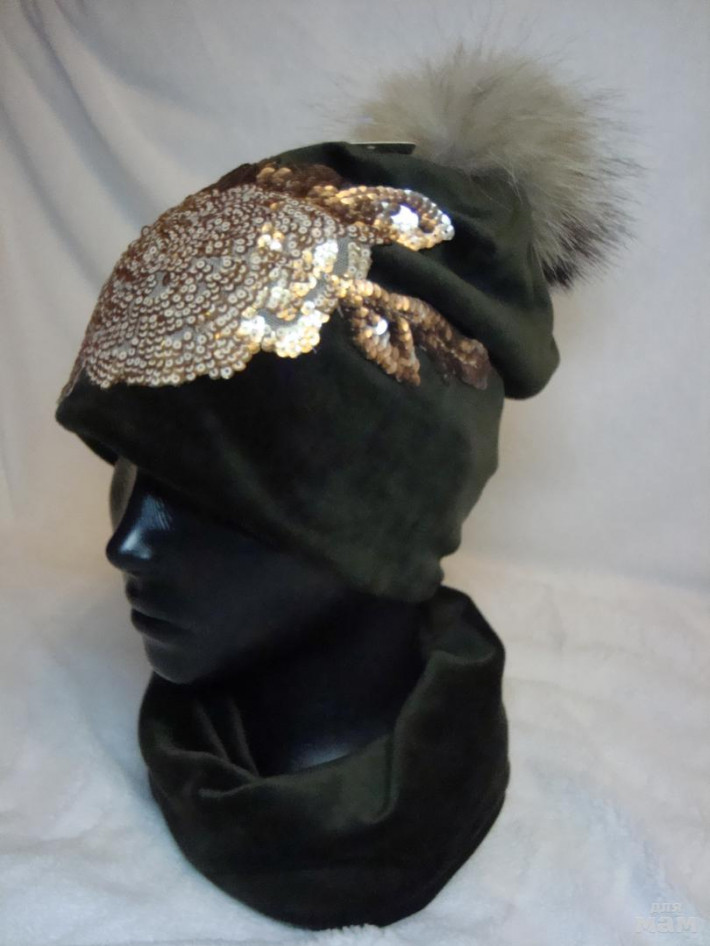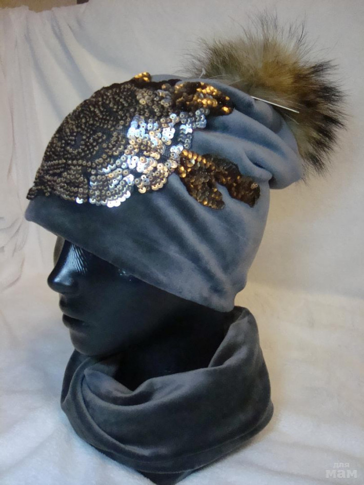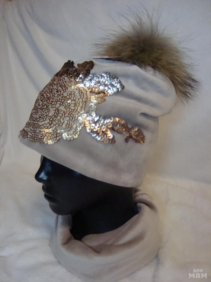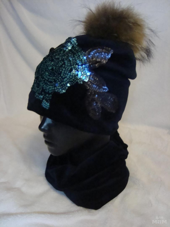 Шапка двойной велюр,украшена пайетками+снуд-повязка на голову.