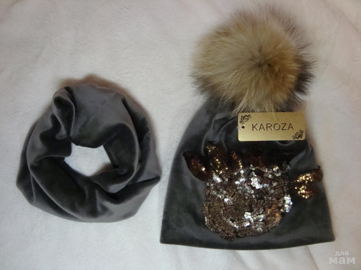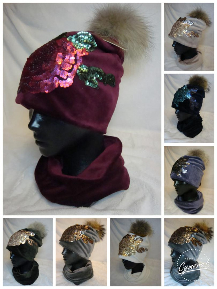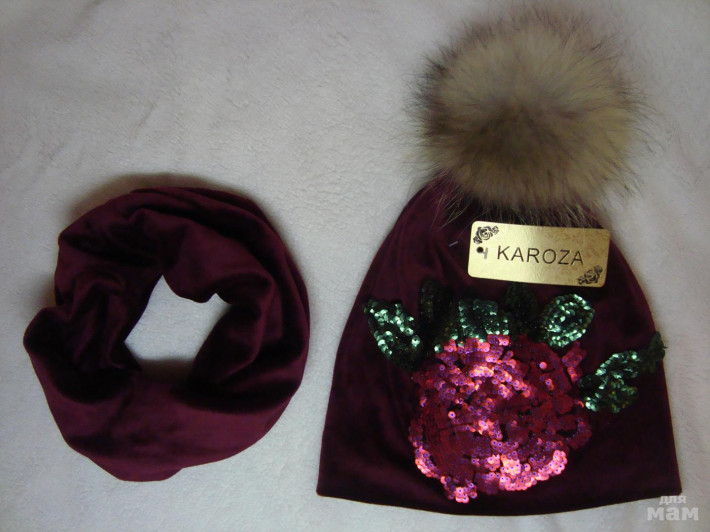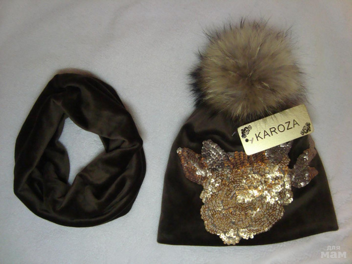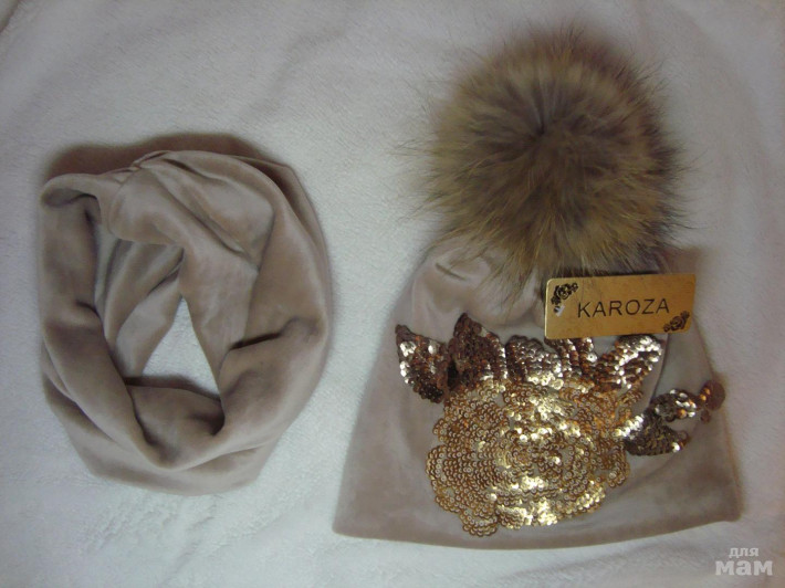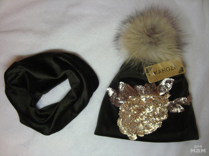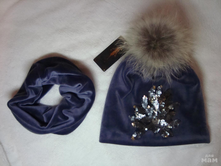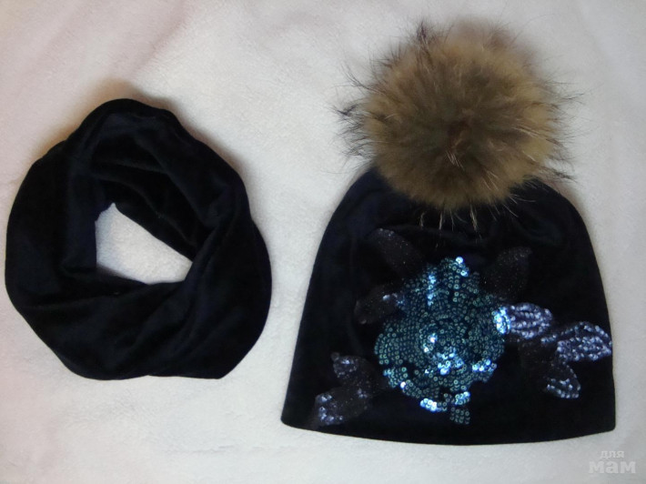 Шапка двойной велюр,украшена пайетками+снуд-повязка на голову.