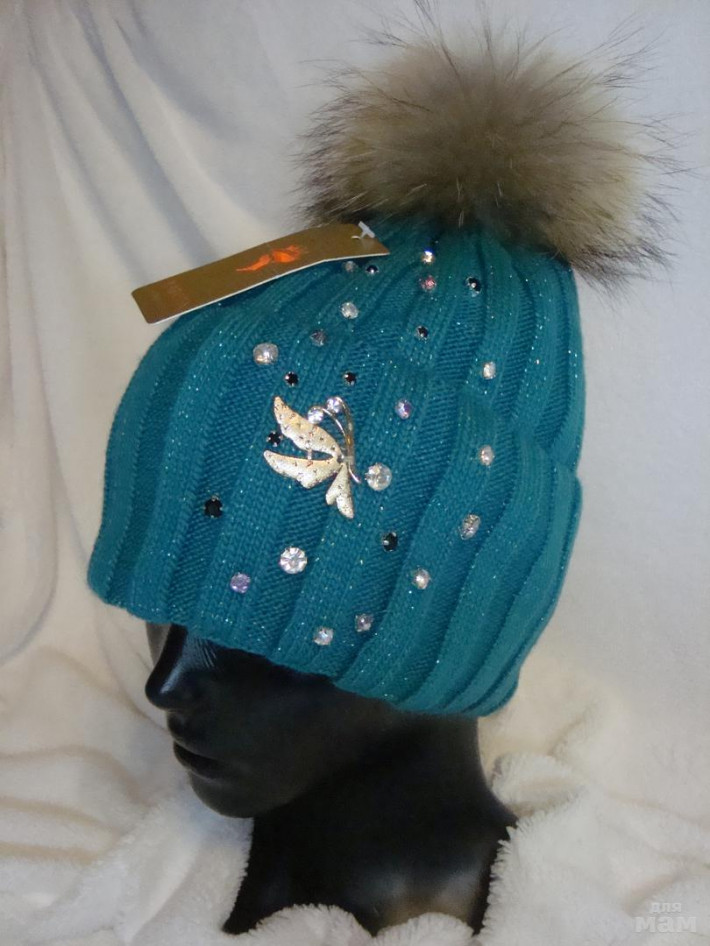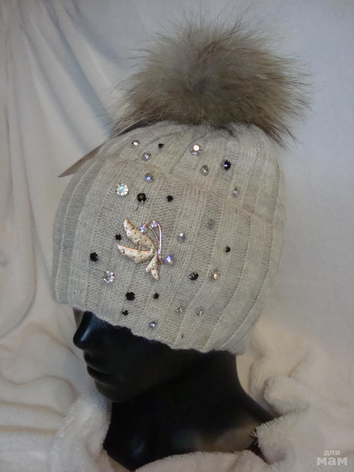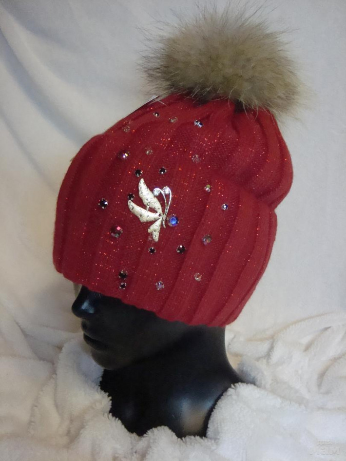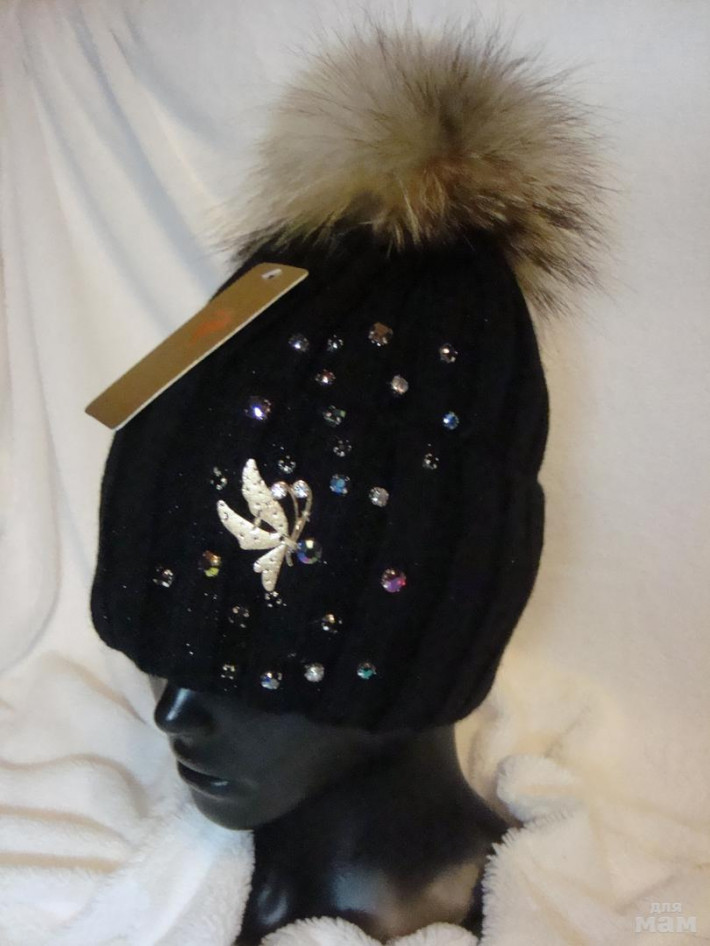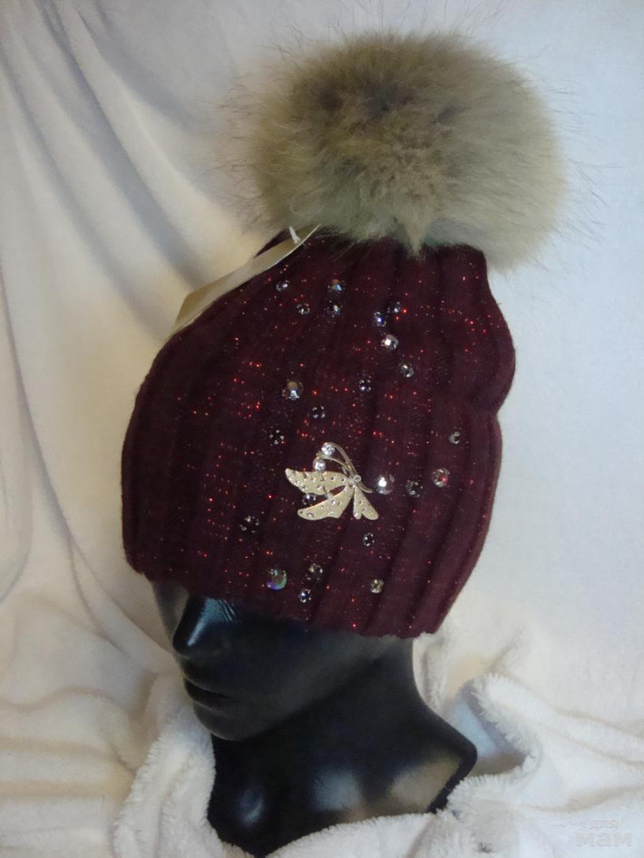 Шапки на флисе,с люрексом,украшена стразами и декоративной брошью "бабочка".