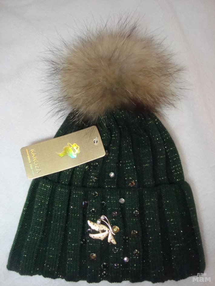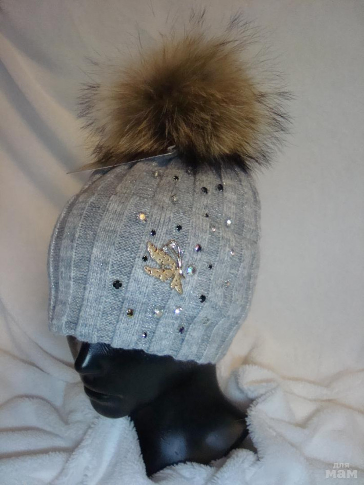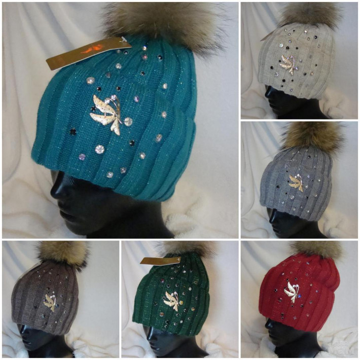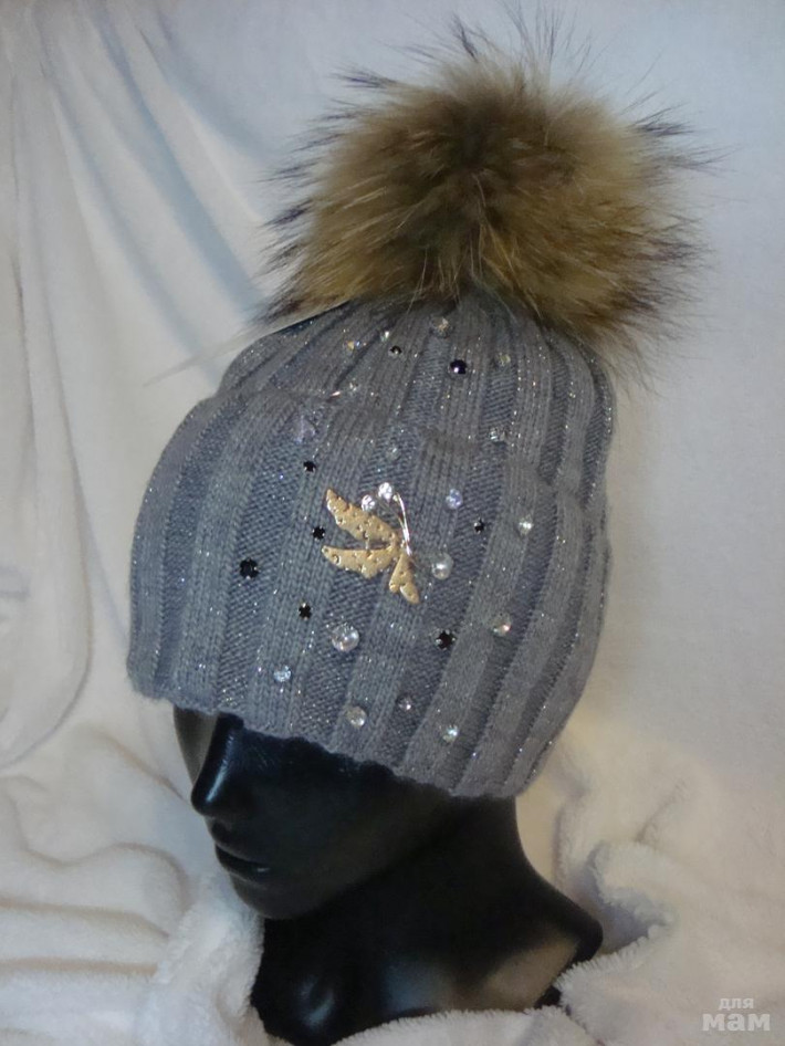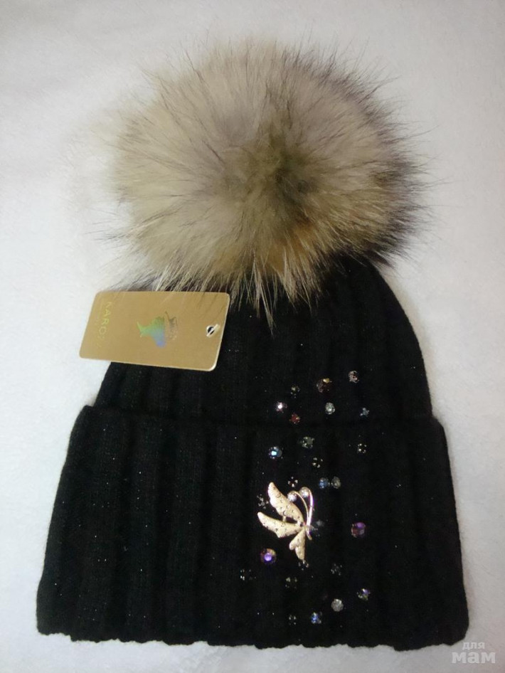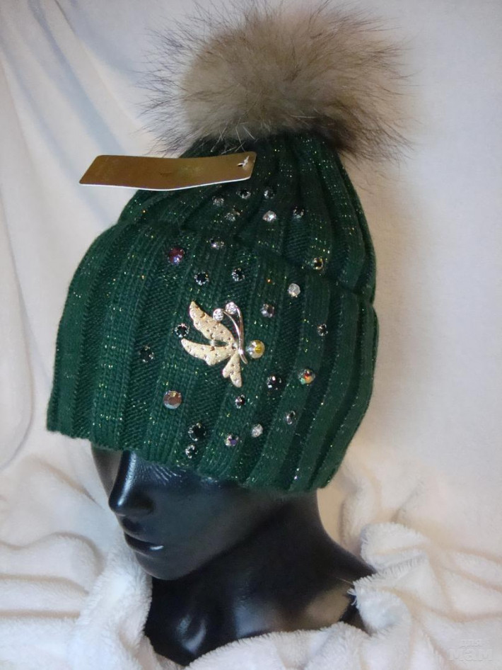 Шапки на флисе,с люрексом,украшена стразами и декоративной брошью "бабочка".