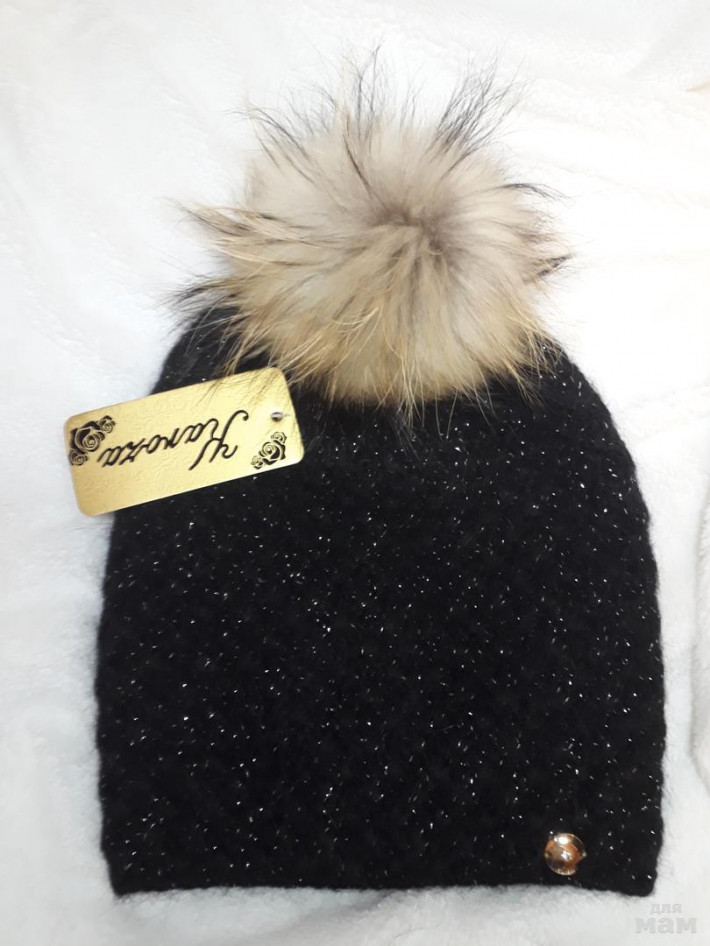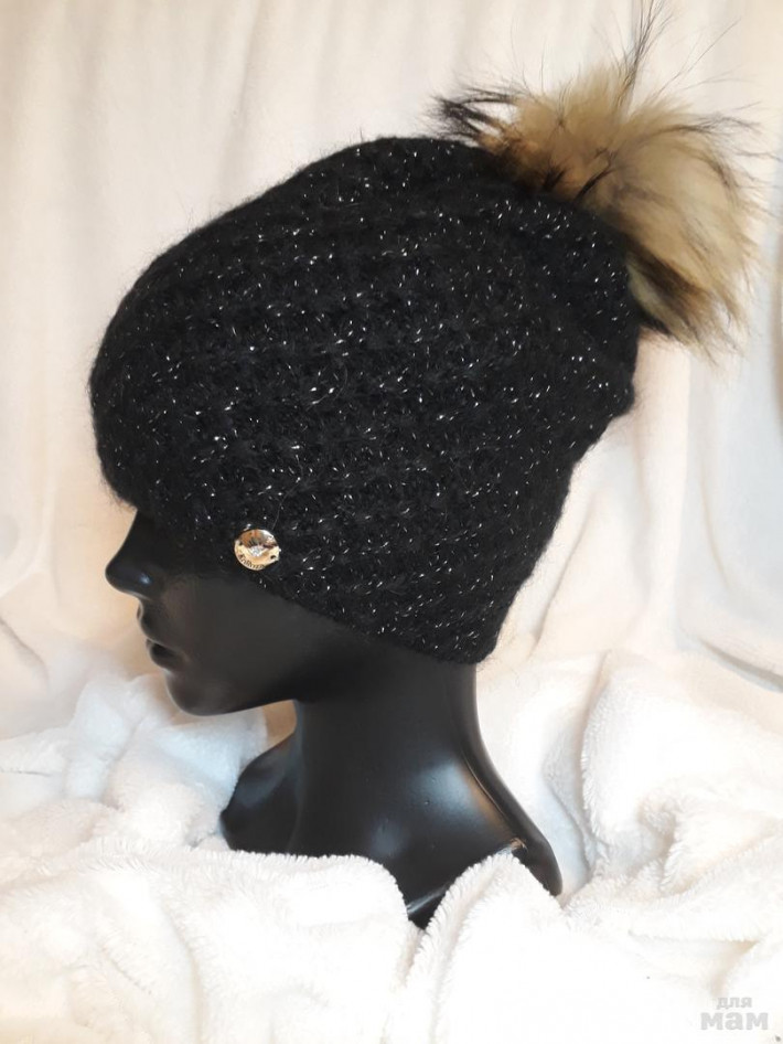 Шапка вязанная Karoza: шапка черная на флисовой подкладке,провязана серебряным люрексом, помпон натуральный (енот).