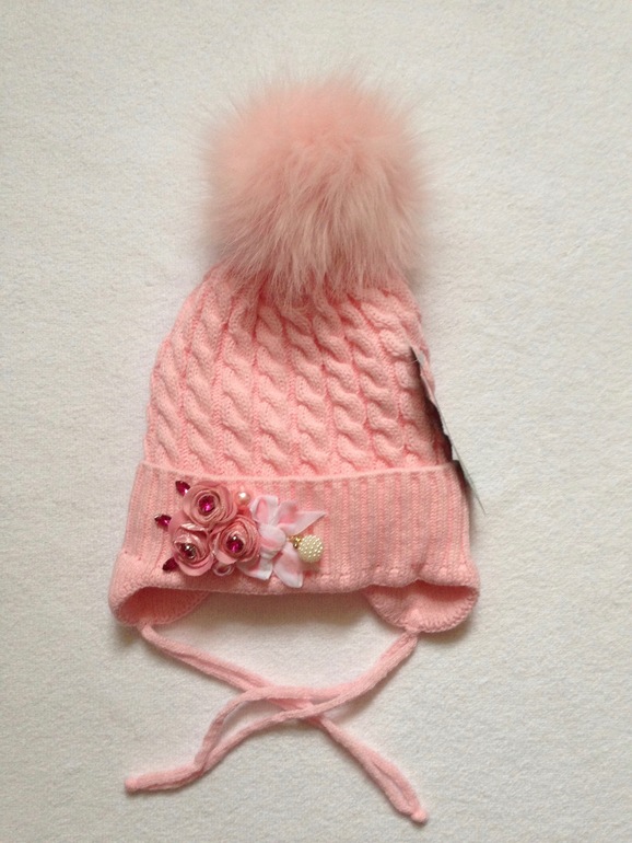 Шапочка с розочками, одинарная вязка, шерсть с акрилом+утеплитель иск мех, на окр. головы 46-48, розовая