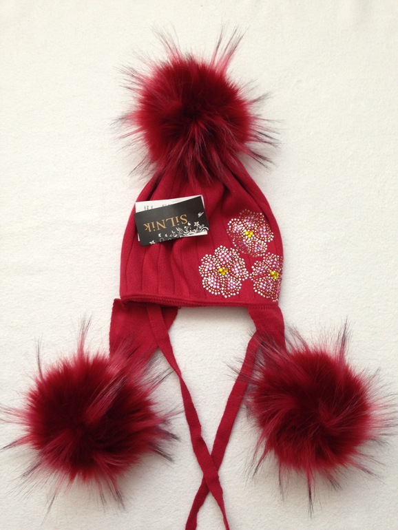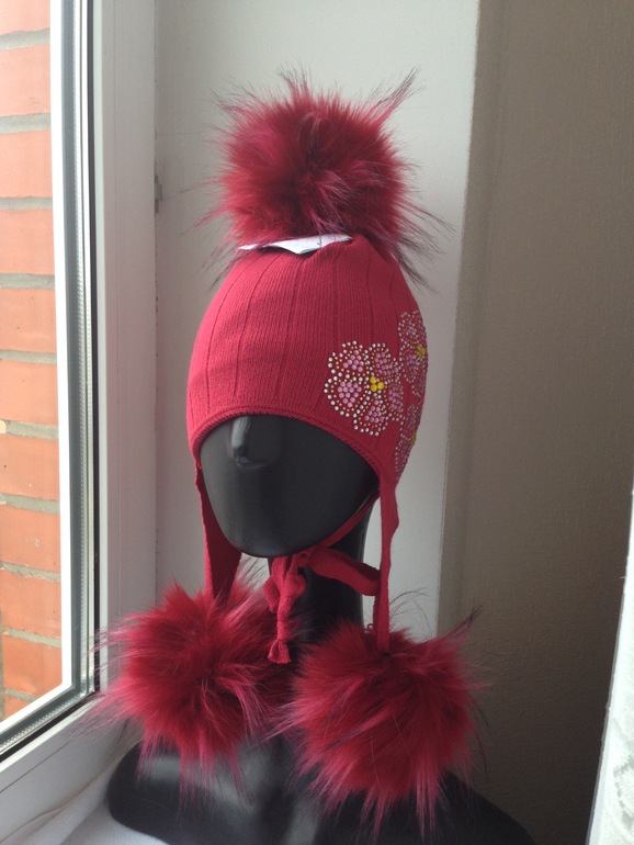 Шапочка с тремя помпонами, шерсть+подкладка флис, на окр. головы 49-51 ,бордовая