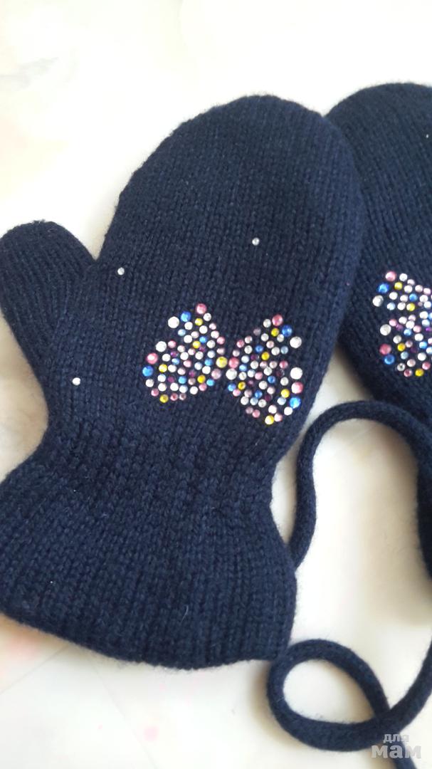 Теплые варежки с трикотажной подкладкой.Цвет темно-синий, разноцветные стразы..Состояние очень хорошее..