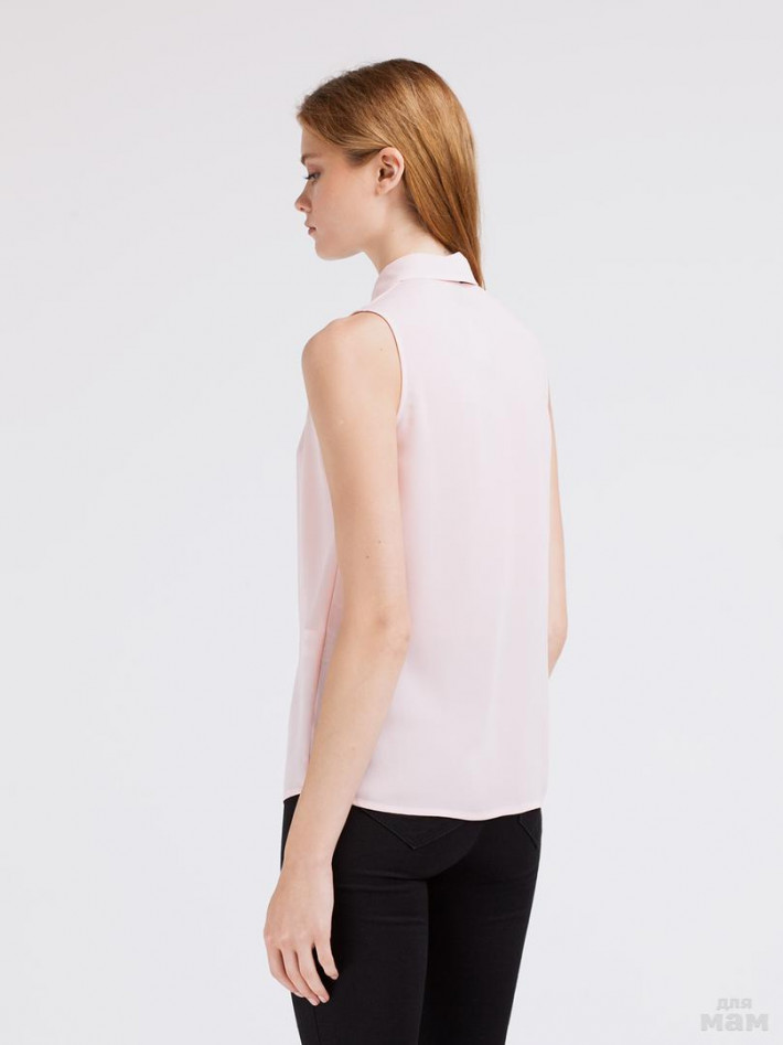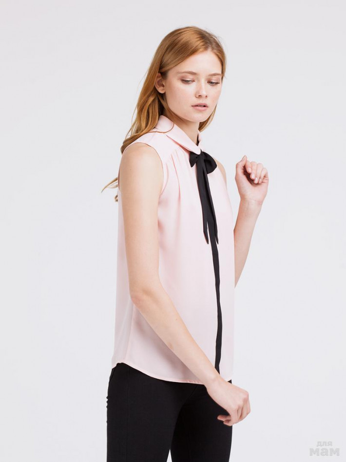 Рубашка прямого силуэта. Вырез круглый, отложной воротник с контрастным бантом, без рукавов.