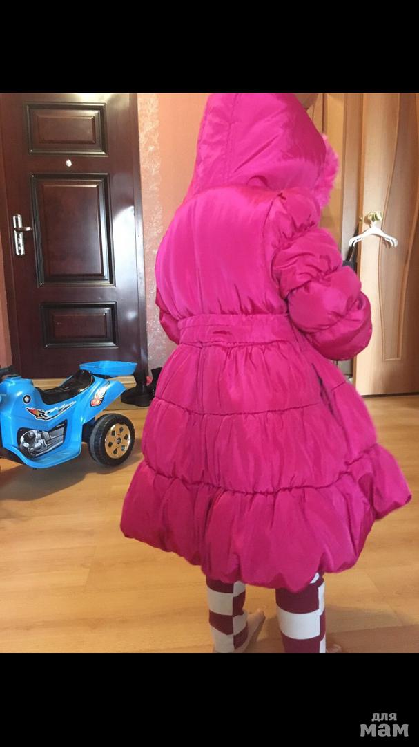 Пальто на синтепоне, очень эффектно смотрится. Носить можно от 100см и 110-115 легко, на фото ребёнок ростом 100см. Состояние хорошее.