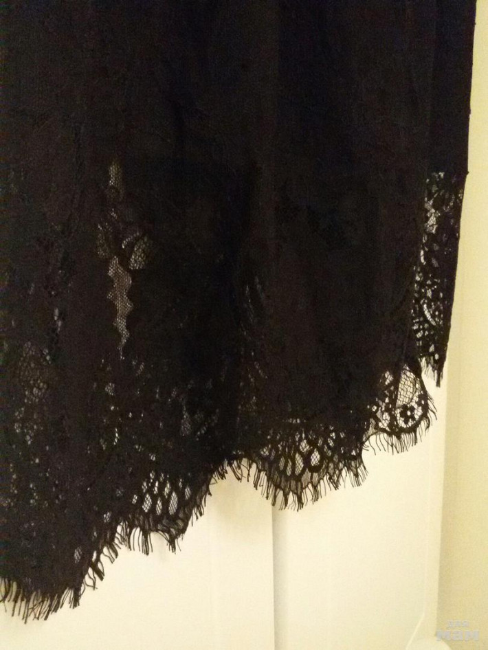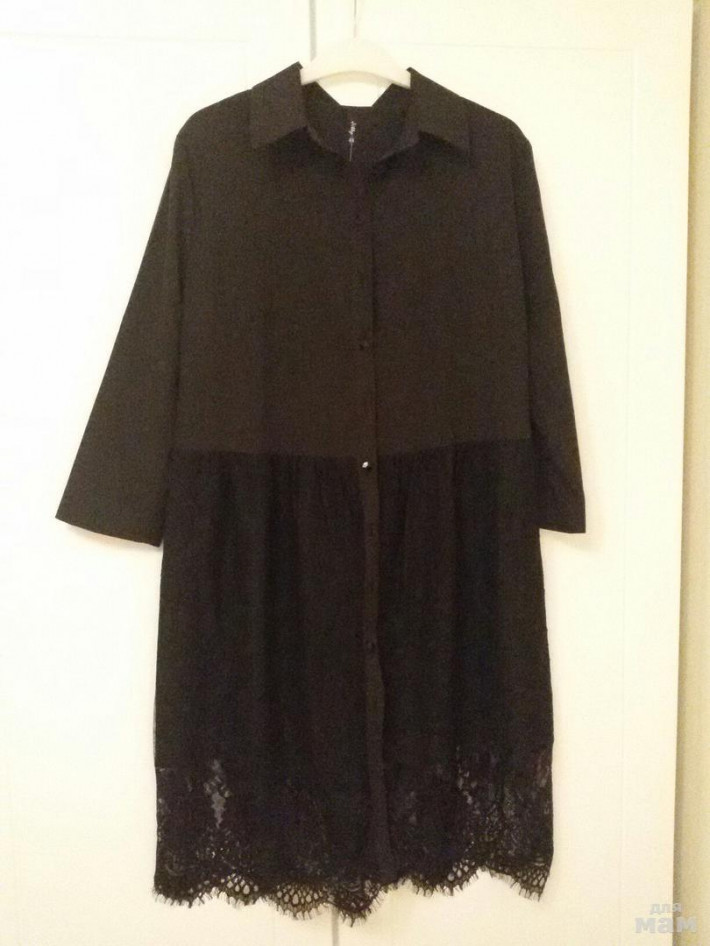 Платье-рубашка свободного силуэта из плотного шифона. Изделие отрезное по линии талии. Верхняя деталь юбки из гипюра, слегка присборена сверху. По переду платья расположена притачная планка, застегивающаяся на пуговицы. Рубашечный воротник. Рукав 3/4.
