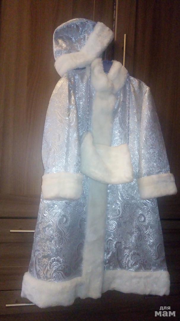 Костюм снегурочки: пальто, шапочка и муфта. Материал - парча, отделка - иск. мех. Без подкладки. Ширина по груди - 40 см., Длина - 75 см. Подходит для старшей группы детского сада или начальной школы.