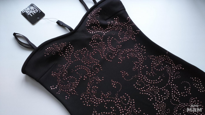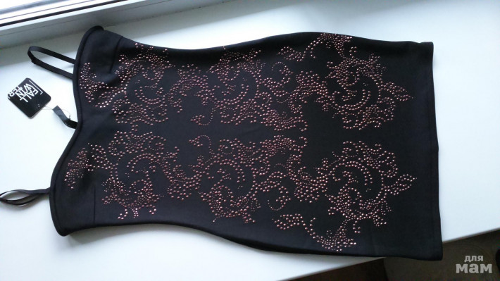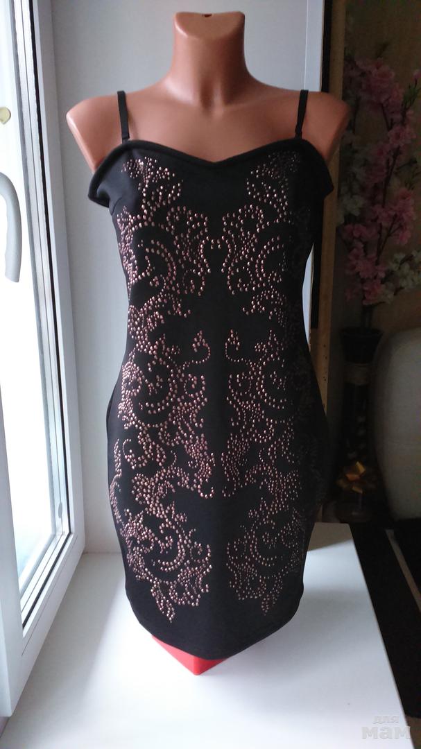 Стильное НОВОЕ вечернее платье из вечерней коллекции Fall Winter. Платье СИЛЬНЫЙ стрейч с утягивающим эффектом, цвет черный с коричневыми крупными стразами-клепками! Смотрится очень богато!!! У платья спереди есть силикон (чтобы еще лучше село в области груди), также плотная резинка по спинке, его можно носить как с лямками (брительки), так и без них, брительки регулируются в свою очередь.