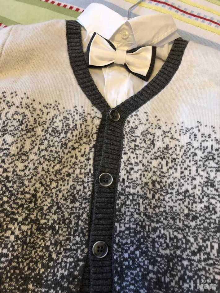 Личный пристрой, эти размеры уже давно разобрали) Итальянский бренд, крутое качество. Комплект из 4х предметов - брюки, рубашка, джемпер, бабочка.