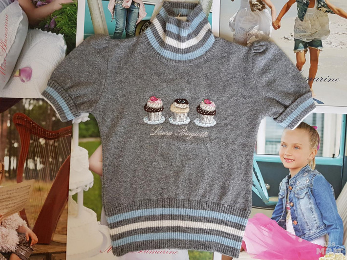 8)Свитер Laura Biagiotti с коротким рукавом светло-серый с люрексом и вышитыми пирожными.Размер 7/8