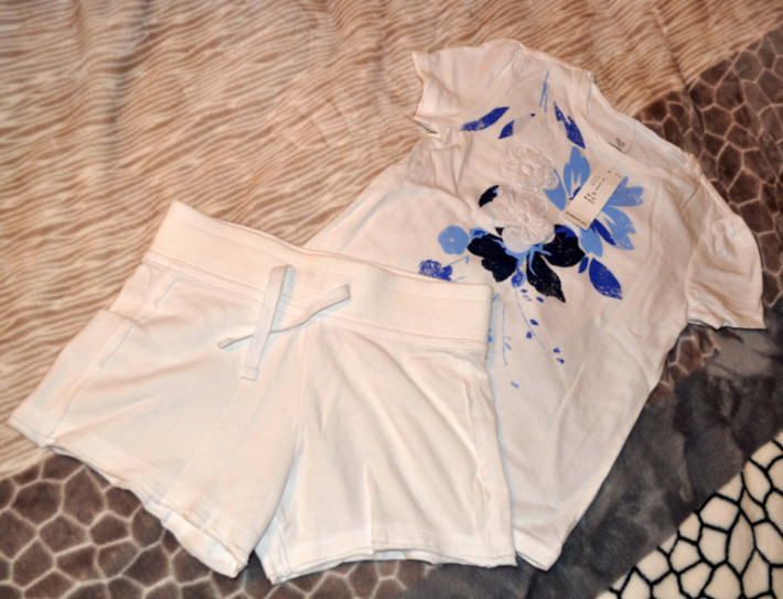 Футболка OLD NAVY4Т (большемерит). Длина 41 см, ширина 29,5 см. Белые цветы нашиты на футболку. Все 100% cotton. 300 рублей.