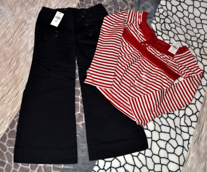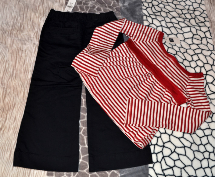 Комплект Baby Gap. Плотные темно-синие брюки 4Т. Сзади на резинке. Длина 57 см, шаговый 40,5 см, талия 26,5см на резинке. 500 рублей.