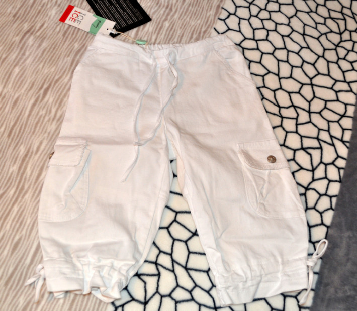 Летние капри Miss Blumarine из тонкой джинсовой ткани. Размер 6. 100% cotton, 2% elastan - есть небольшой стрейч. Пояс с утяжкой, карманы и спереди и на попе. Внизу на штанинах декоративные молнии.