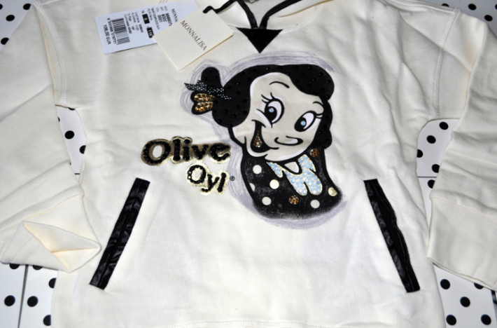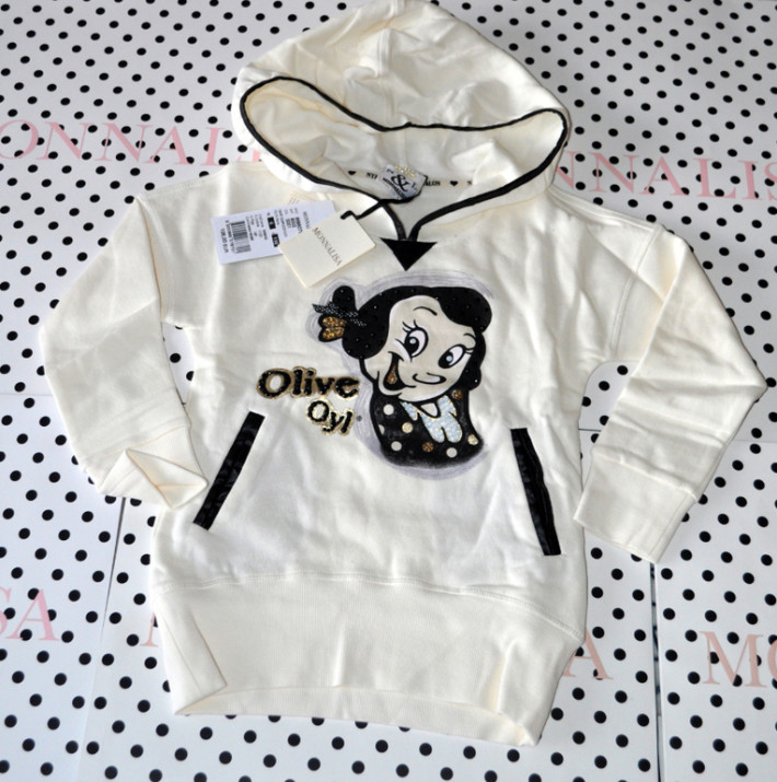 ДЕТСКИЙ БУТИК новое. 3-6 лет.Теплая олимпийка ( по русски байка с начесом) Оливия. Моналиса. Маркировка 6 лет, рост 116. Цвет молочный. Карманы и капюшон оторочены кожей. Девочка красиво украшена стразами трех цветов и бантиком, надпись выложена черными камушками. Соответствует размеру, но не на пузатиков. Нам по ширине не подошла, сильно обтягивала живот.