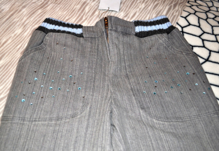 ДЕТСКИЙ БУТИК новое. 3-6 лет. Брюки без утеплителя, просто из плотной джинсовой ткани. Пояс из трикотажа как рукава, внутрь вставлена резинка. Сзади два кармана и спереди два кармана. Так же спереди брюки украшены россыпью голубых и белых страз разного размера. Внизу декоративные молнии. Смотрится костюм очень красиво - ну а мы как всегда мимо!(((.