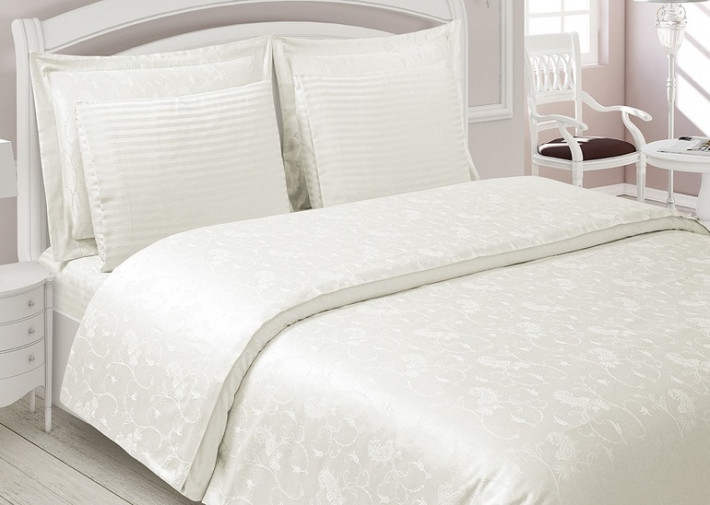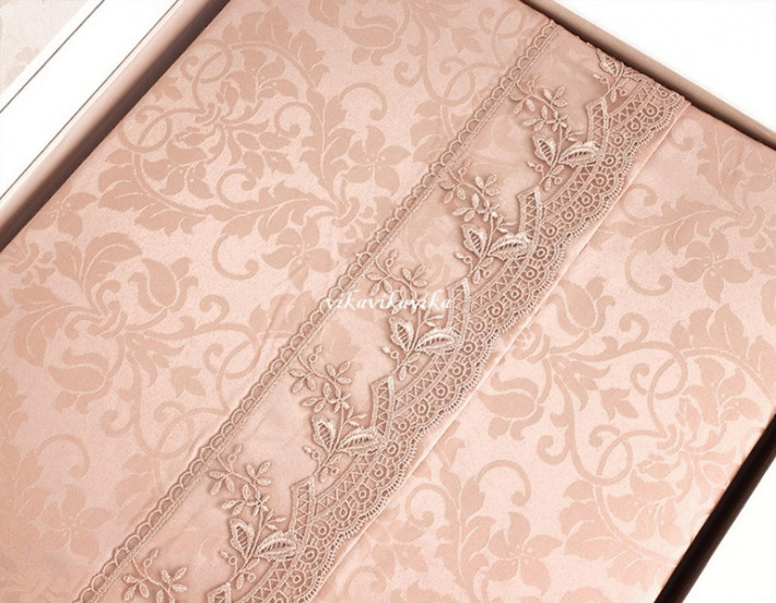 Изысканное постельное белье из бамбового волокна с отделкой из кружева. Великолепное украшение для любой спальни. Пододеяльник с застежкой на пуговицах (снизу). С внешней стороны декоративная горизонтальная вставка кружевной полосы. Простыня с жаккардовым рисунком в полоску. Наволочки 50x70 с ушками (5см.), на клапане. Ушки с кружевом. Состав 100% бамбук