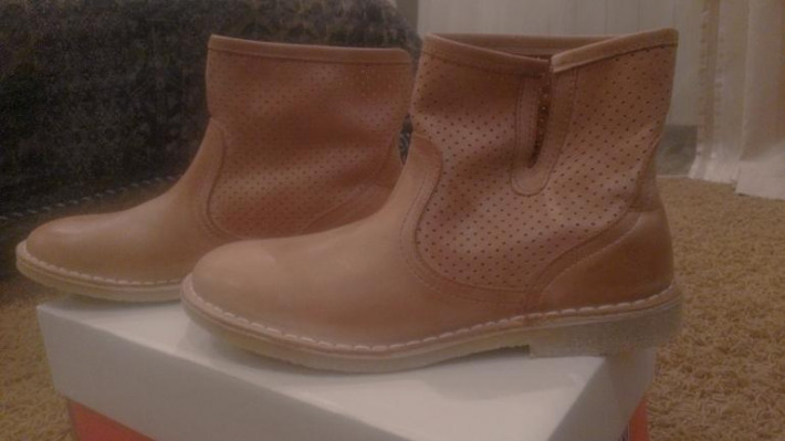 Легкие сапоги из гладкой кожи. Верх - натуральная кожа. Подошва -полиуретан. Часть верха выполнена с перфорацией и эффектом потёртости. 37 размер.