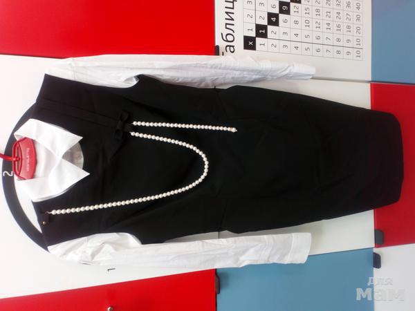 Стильный современный комплект, подойдет для деловых встреч и для работы в офисе. Сарафан полуприлегающего силуэта, выполнен из костюмной ткани (на подкладке) и декорирован отделочным элементом в виде банта с жемчужными бусами (съемные). Застежка на потайную тесьму-молнию в левом боковом шве. Полочка с подрезом и карманами. Сзади по низу среднего шва – шлица. Блузка полуприлегающего силуэта, спереди планка с застежкой на петли и пуговицы. Воротник отложной на стойке. Рукав реглан-погон с заложенными складками, по низу манжет.