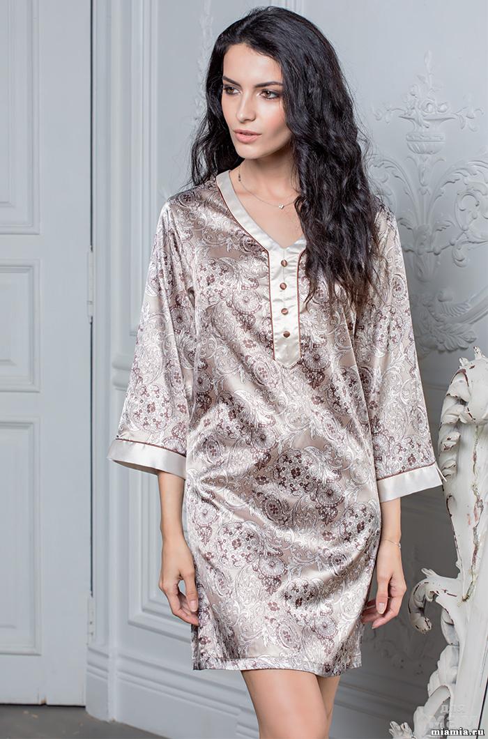 Платье-туника Mia-Mella с рукавом ¾ и боковыми разрезами. Манжеты и V-образный вырез выполнены из светлого атласа и декорированы тесьмой, вырез также украшен декоративными пуговицами.