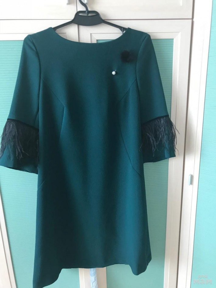 Платье Buter, маркировка 50 р. Но Будет хорошо на полный 48 р. Новое, красивого изумрудного цвета. Платье полуприлегающего силуэта. По переду полурельефы. По спинке от горловины до низа две декоративные складки. Застежка на потайную тесьму-молнию. Рукав 3\4 втачной двухшовный. Низ рукава оформлен воланом с перьями. Перья не съемные. Брошь в комплекте.