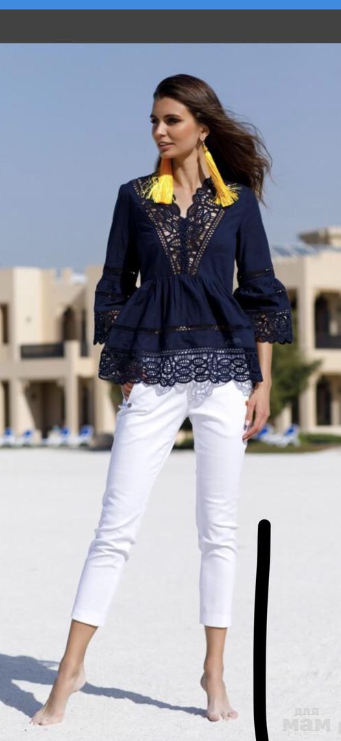 Изысканный летний комплект. Блузка выполнена из хлопкового полотна с шитьем. Вырез “V”- образный, по низу присборенная баска. Рукав втачной с присборенным воланом. Брюки 7/8, выполнены из легкой костюмной ткани. Застежка спереди на тесьму-молнию по типу “гульфик”. Верхний срез обработан поясом 3,5 см. Спереди карманы в отрезном бочкецена.