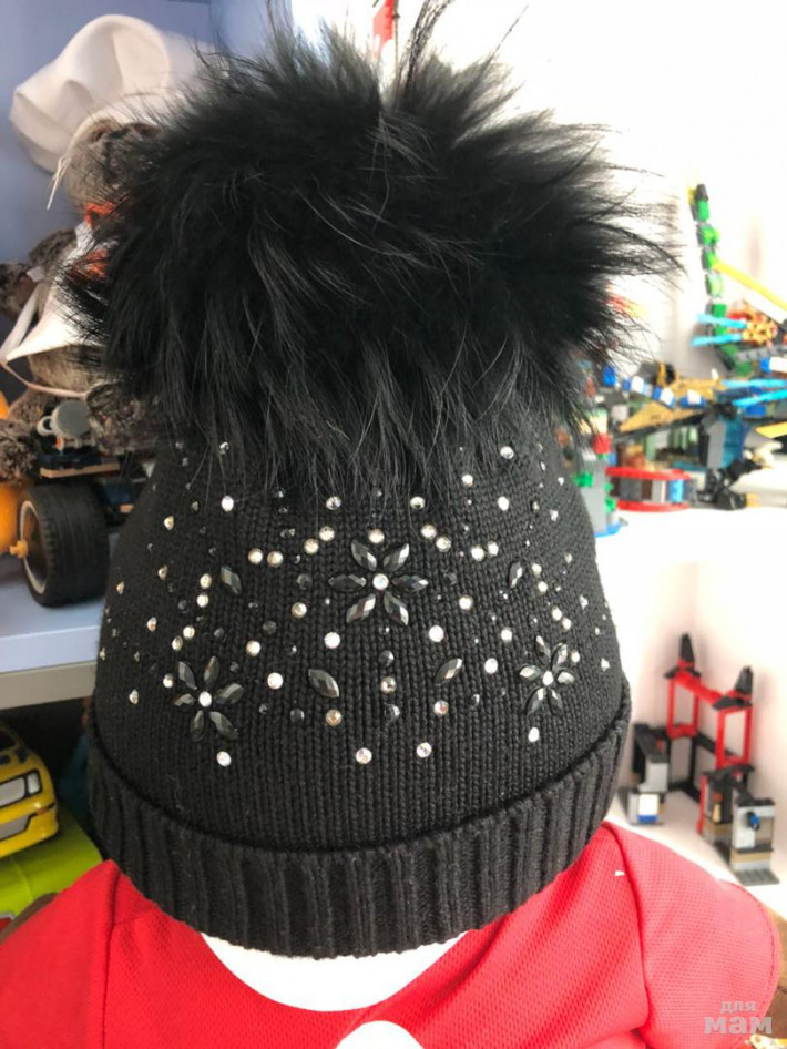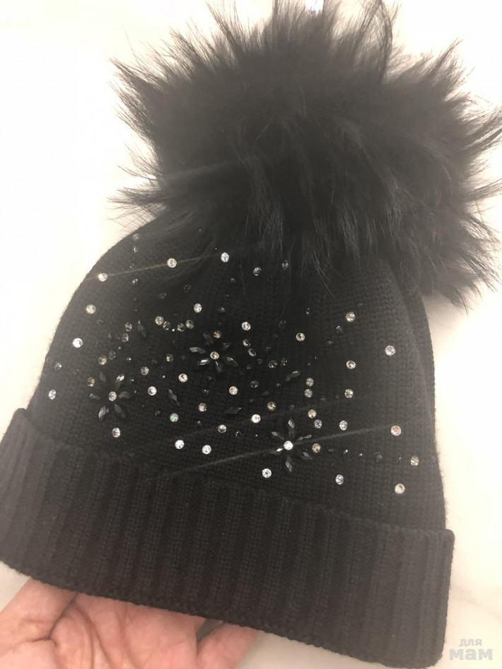 Шапочка на шерстяном подкладе, в отличном состоянии. Стразы на месте. Огромный помпон цвет чёрный