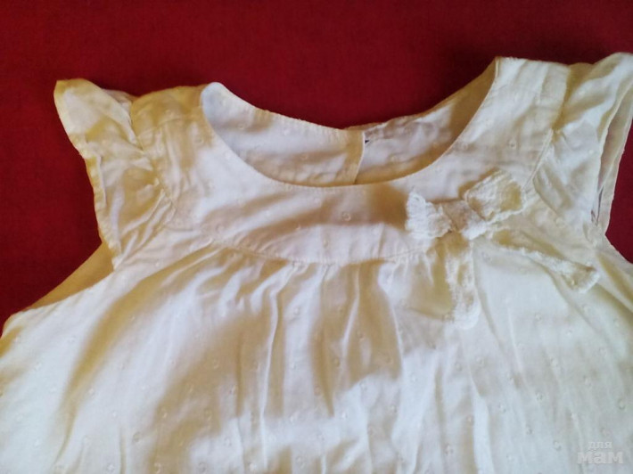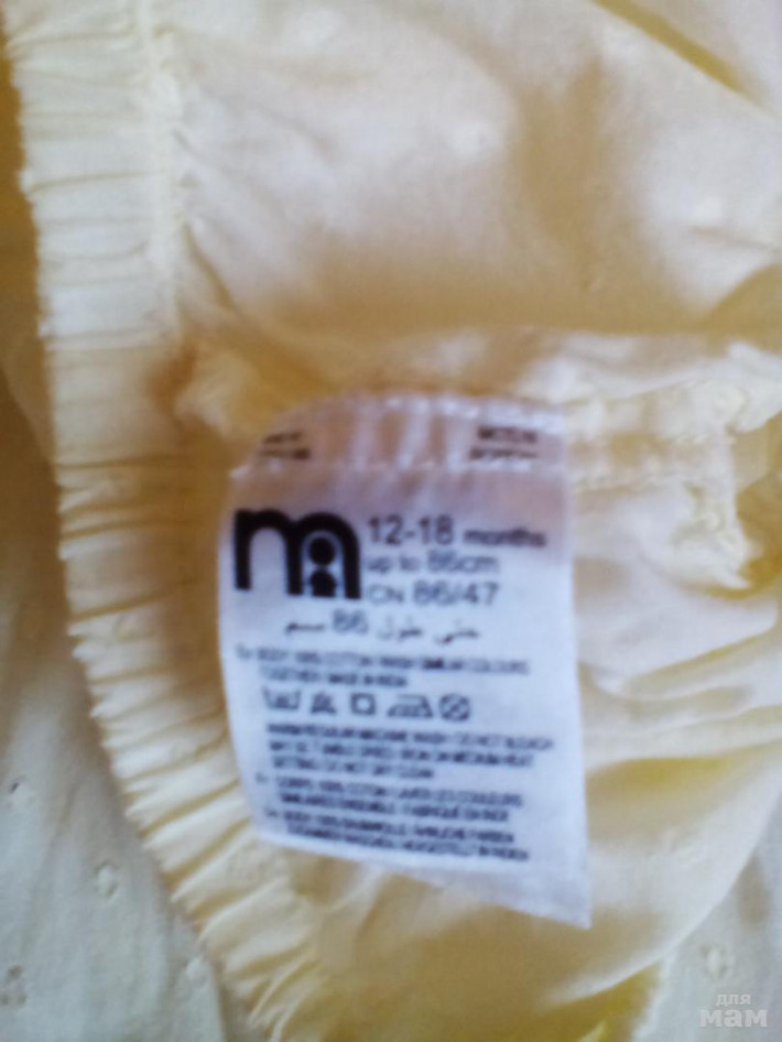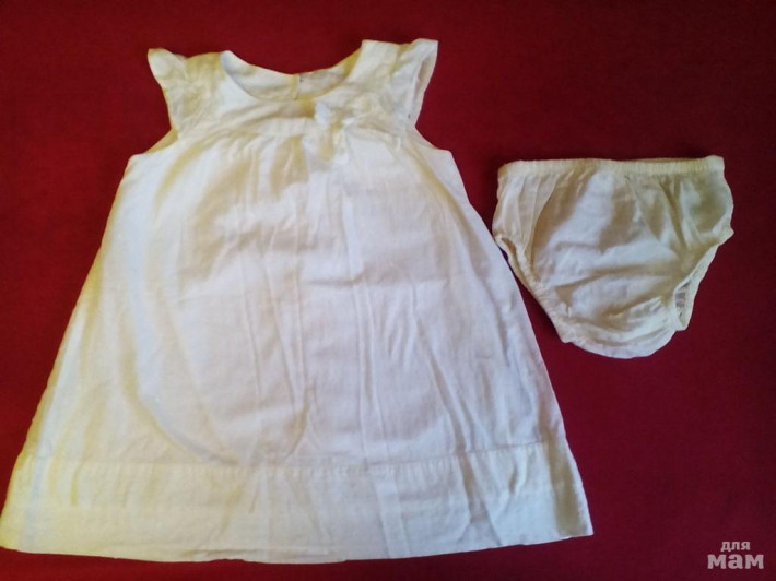 Платье + трусы Mothercare размер12-18 мес., но из-за покроя можно носить до 2,5 лет. Ткань фактурная, не трикотаж. Сзади на пуговках. Трусы новые. Украшено игривым бантиком. 100% хлопок. Покупала за 1700 р. Цвет светло-желтый. Состояние очень хорошее.