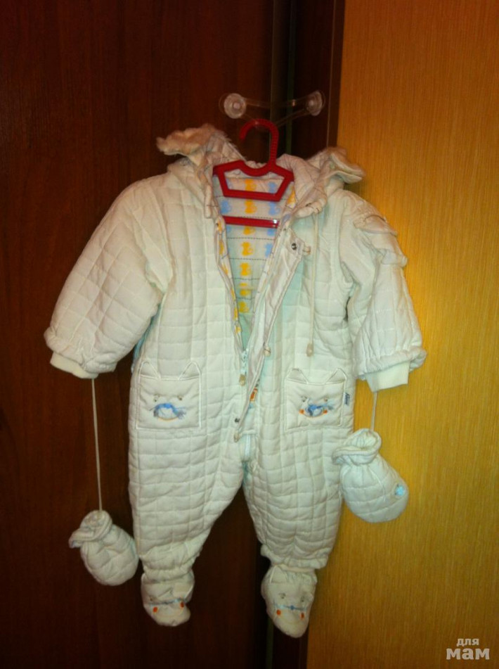 Комбинезон рост 80, носили апрель-май в коляске (носить можно и с более раннего возраста, ребенок все равно сидит или спит в коляске). .Очень красивый, снаружи и внутри хлопок,соответственно дышаший, утепленный синтепоном. Стирается в машине, есть отделка мехом (мех отстегивается)Производство Турция.