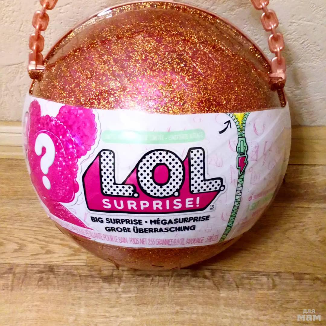 Огромный золотой шар, 35см, в котором вы найдете 50 разнообразных шаров сюрпризов. Там будут и Куклы LOL и их маленнькие сестрички Lil Sisters и шарики с аксессуарами для куколок и Шарики CharmFizz Бомбочки для ванной. Куклы и аксессуары которые вы найдете внутри - самые редкие, глиттерные, с блестками их не найти в других сериях.