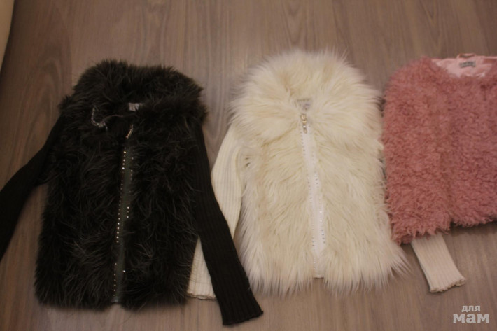 Две трикотажных кофточки спереди мех,со стразами белая и зеленая,совершенно одинаковые. Очень нарядные 8-10 лет, в отличном состоянии и меховая шубка Некст, 2000 руб. за три