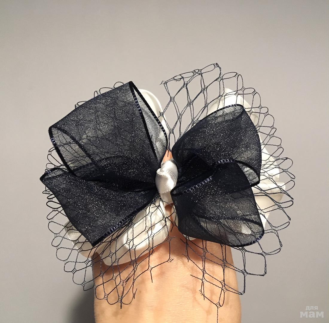 Стильный бант на резинке из атласа, капроновой ленты и паутинки. Длина 10 см