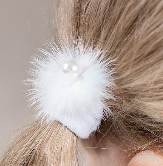 Восхитительная меховая резинка, украшена в центре жемчужиной, отлично украсит прическу девочки. Диаметр 3 см.