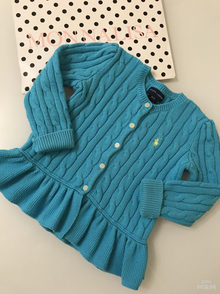 Кардиган Ralph Lauren на девочку 3-4года. Практически новый, одевался считаные разы, но ребёнок успел уделаться шоколадом, который ничем не отстирывался, на одном манжете внутри есть светлые пятна от пятновыводителя, снаружи их нет,в остальном прекрасное состояние. На фото детально все показано.