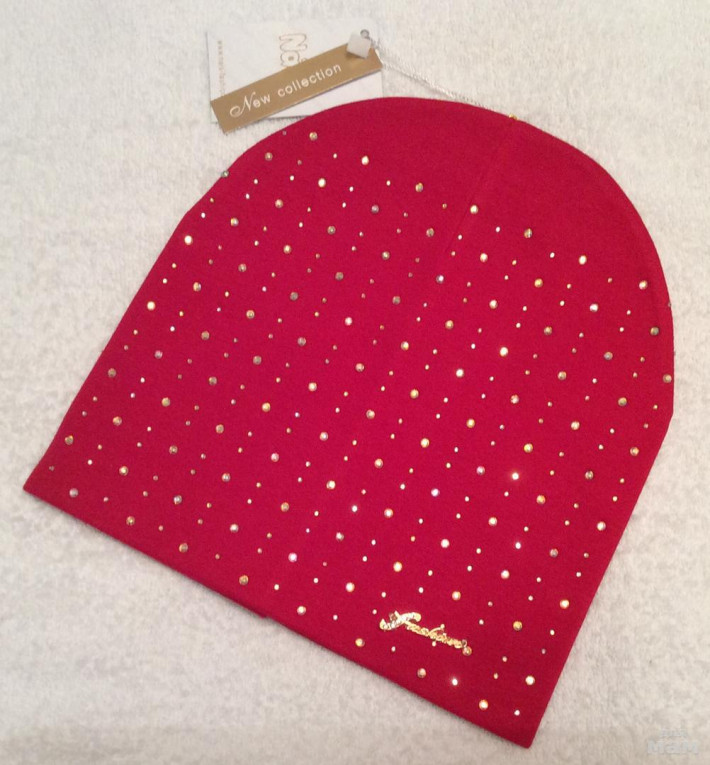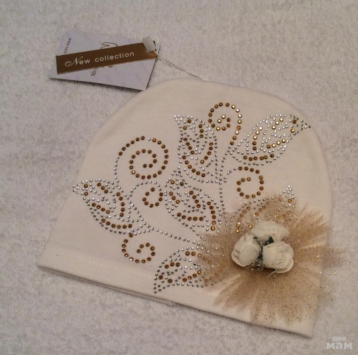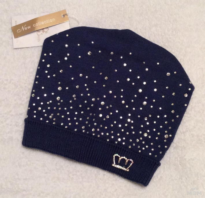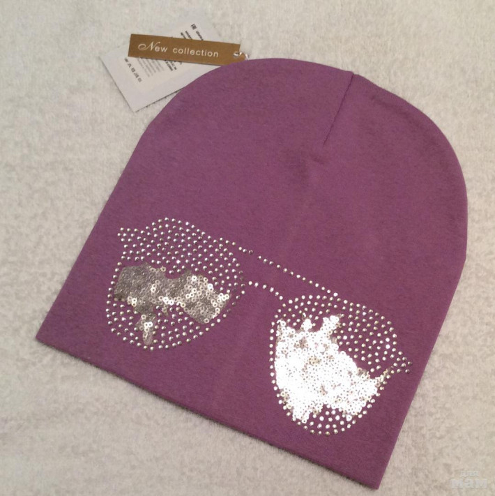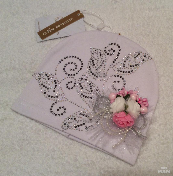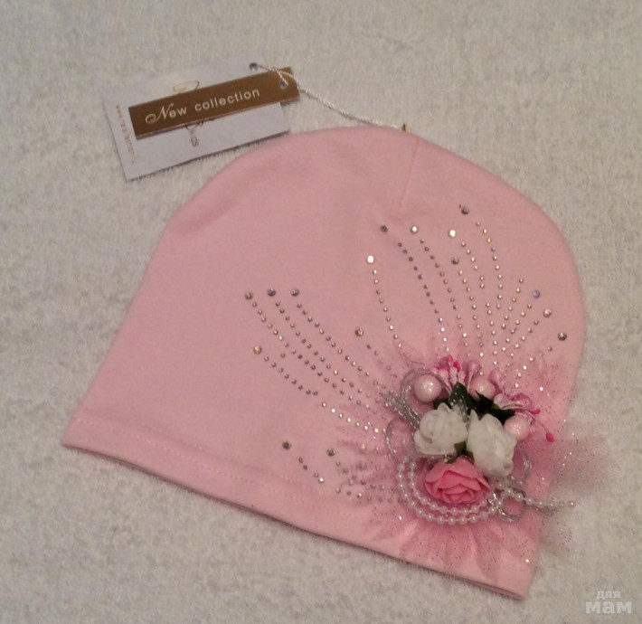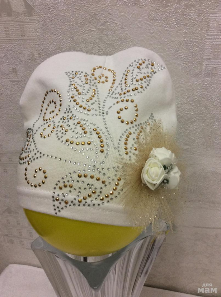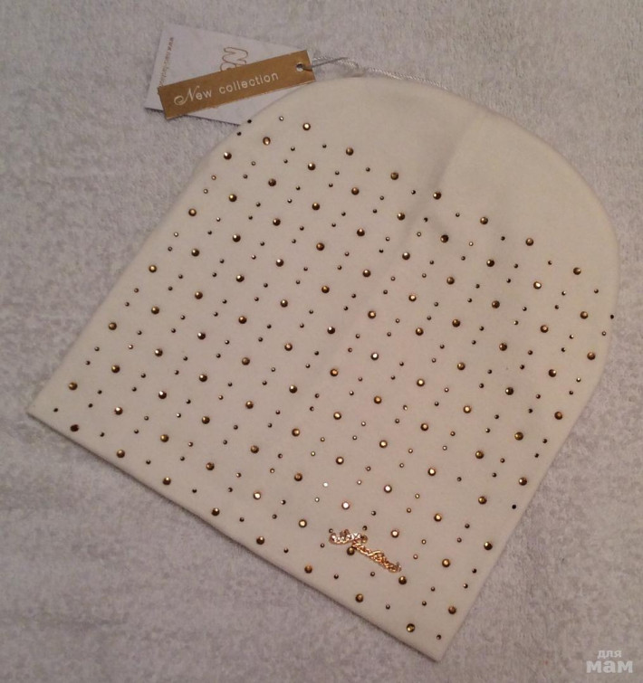 Плотная хлопковая шапочка, очень красивая посадка, за счет загиба сидит очень аккуратно,стразики все сверкают