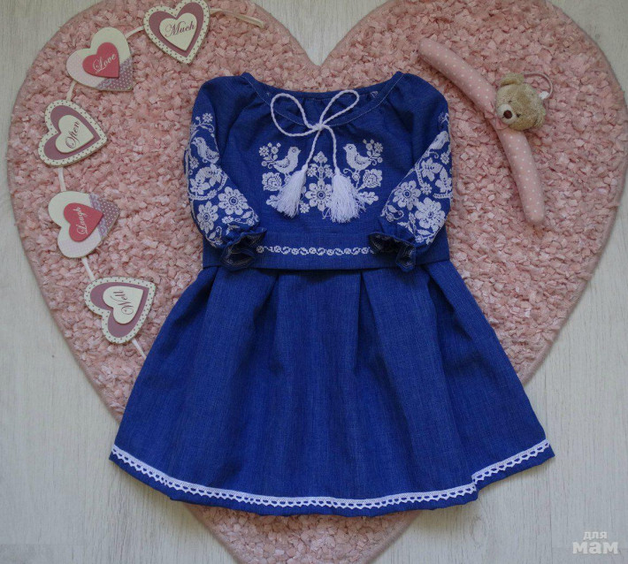 платьице под джинс (ткань лён-габардин).возраст 4-6 лет.рукав 3\4) от горловины 30 см длина платья 66 см, по груди 35 см.Оч красивое.Вышивка машинная