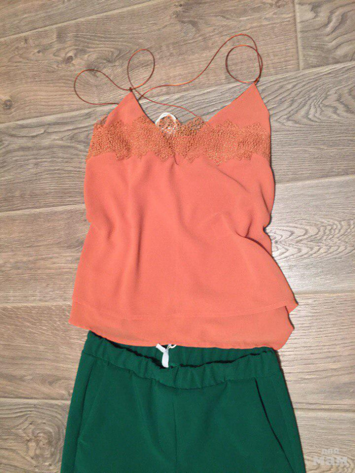 майка персик размер с,брюки на резинке размер с зеленые, хс красные
